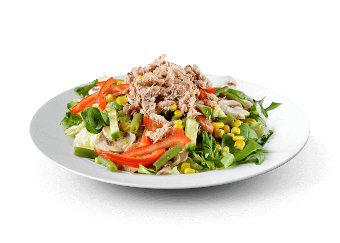 Salade, tomates, maïs, thon + Sauce vinaigrette.